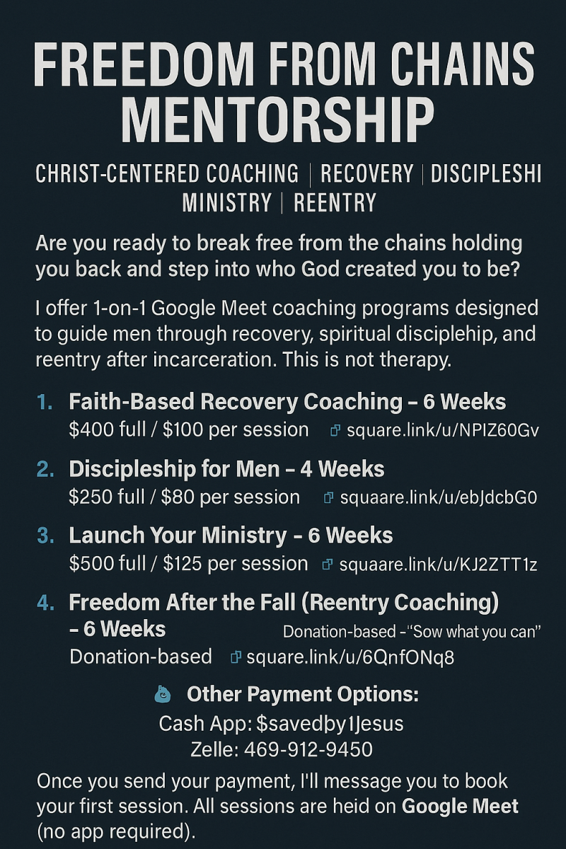 Discover the transformative power of Freedom From Chains Mentorship. We're dedicated to guiding individuals towards recovery and a fulfilling life rooted in faith and second chances. Join us and become part of a story of redemption and hope.